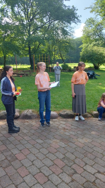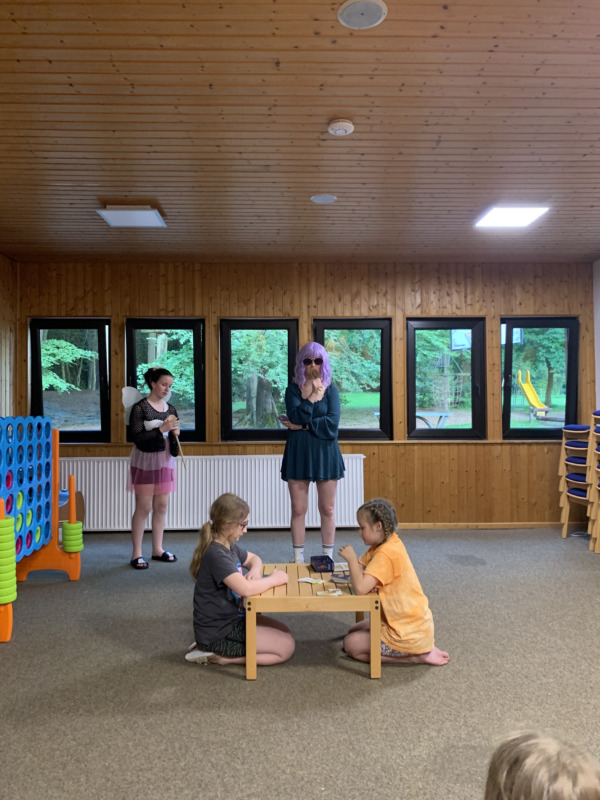 Der dritte und letzte volle Tag begann mit einer aufregenden Schatzsuche, die die Kinder erfolgreich lösten. Am Nachmittag wurden erneut der Pool und die Hüpfburg geöffnet, es gab Waffeln und die letzten Vorbereitungen für den Abend wurden getroffen. Denn da erwartete die Kinder die große Talentshow, moderiert von „Miss Talenta“ und ihrer Talentfee. Alle Kinder leisteten einen Beitrag: Es wurde gesungen, getanzt, geklettert, gezaubert, 4-Gewinnt gespielt, gekickert, Tischtennis und Basketball gespielt, Witze erzählt und vieles mehr. Der krönende Abschluss war ein Tanz zu dem Lied „Barbaras Rhabarberbar“ von Bodo Wartke, den das Leitungsteam in der vorangegangenen Nacht einstudiert hatte. Alle Kinder hatten jede Menge Spaß.