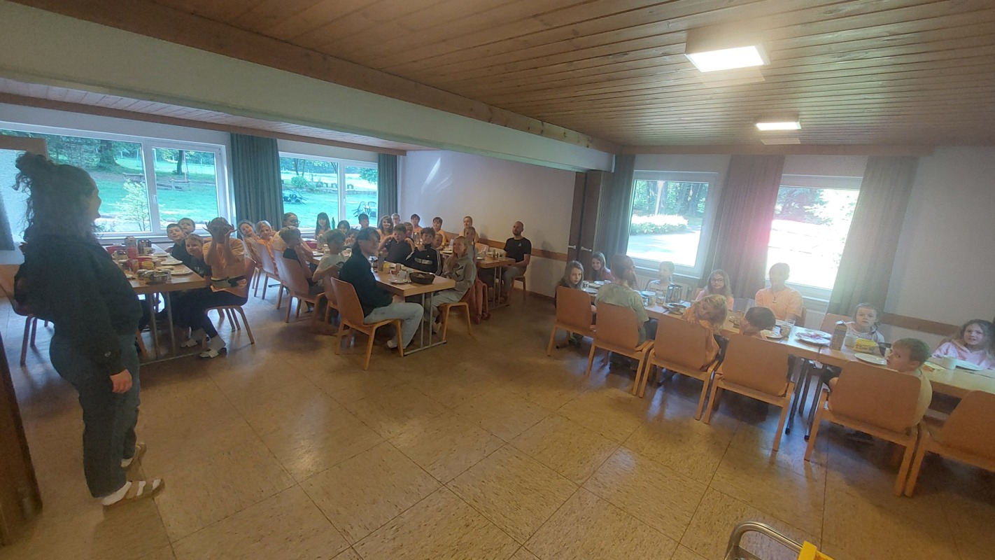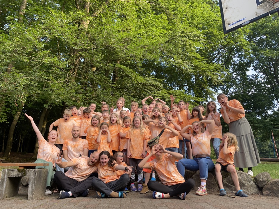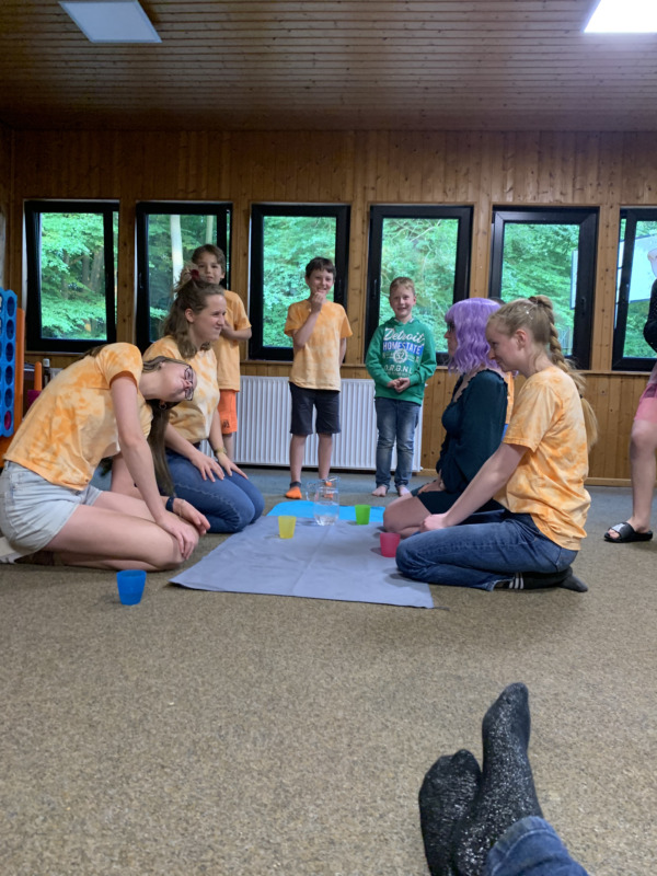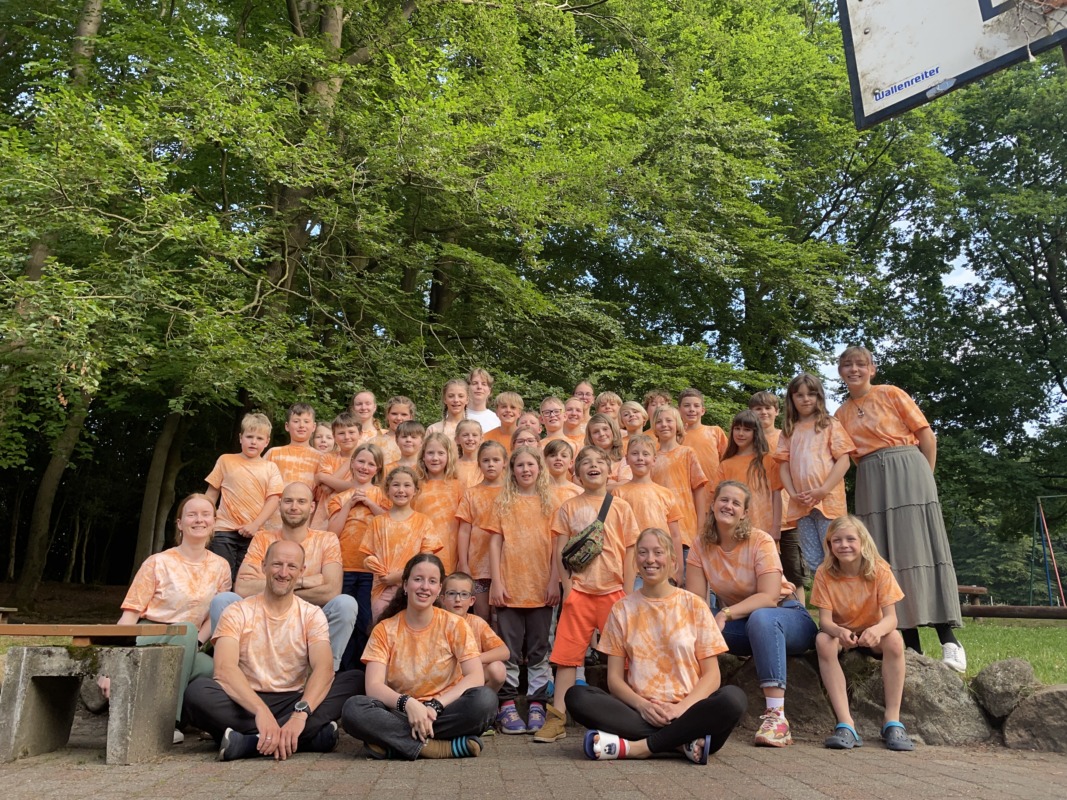 Am 21. Mai starteten 32 Kinder im Alter von 8 bis 12 Jahren mit dem Großbus aus Neuenfelde. Das Leitungsteam hatte vor Ort bereits letzte Vorbereitungen getroffen und das Mittagessen vorbereitet. Nach der Ankunft und der Zimmereinteilung konnten wir gemeinsam die erste Mahlzeit einnehmen. Anschließend wurden einige wichtige Ansagen gemacht und die Kinder hatten Zeit, in aller Ruhe das Freizeitheim und die Umgebung zu erkunden und sich kennenzulernen. Bei strahlendem Sonnenschein konnten die Kinder sofort in den Pool und auf der Hüpfburg hüpfen. Außerdem haben wir T-Shirts gebatikt, die die Kinder als Erinnerung mit nach Hause nehmen konnten. Am Abend gab es das erste Highlight: Alle Leiterinnen und Leiter versteckten sich im Haus und auf dem Gelände, und die Kinder durften sie suchen! Dank der teilweise freizeiterfahrenen Kinder wurden die meisten Verstecke schnell entdeckt.