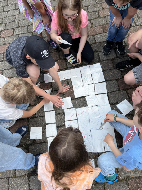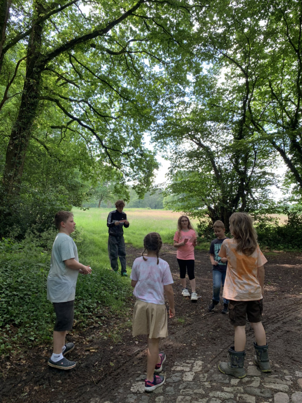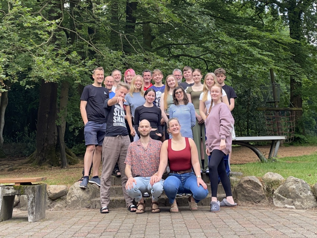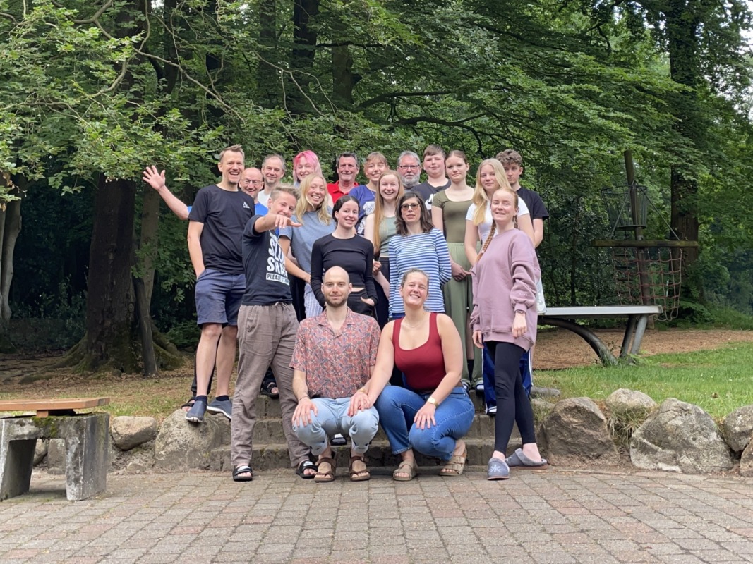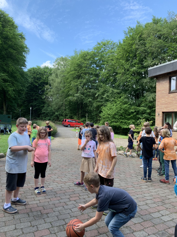 Am 21. Mai starteten 32 Kinder im Alter von 8 bis 12 Jahren mit dem Großbus aus Neuenfelde. Das Leitungsteam hatte vor Ort bereits letzte Vorbereitungen getroffen und das Mittagessen vorbereitet. Nach der Ankunft und der Zimmereinteilung konnten wir gemeinsam die erste Mahlzeit einnehmen. Anschließend wurden einige wichtige Ansagen gemacht und die Kinder hatten Zeit, in aller Ruhe das Freizeitheim und die Umgebung zu erkunden und sich kennenzulernen. Bei strahlendem Sonnenschein konnten die Kinder sofort in den Pool und auf der Hüpfburg hüpfen. Außerdem haben wir T-Shirts gebatikt, die die Kinder als Erinnerung mit nach Hause nehmen konnten. Am Abend gab es das erste Highlight: Alle Leiterinnen und Leiter versteckten sich im Haus und auf dem Gelände, und die Kinder durften sie suchen! Dank der teilweise freizeiterfahrenen Kinder wurden die meisten Verstecke schnell entdeckt.