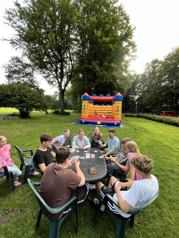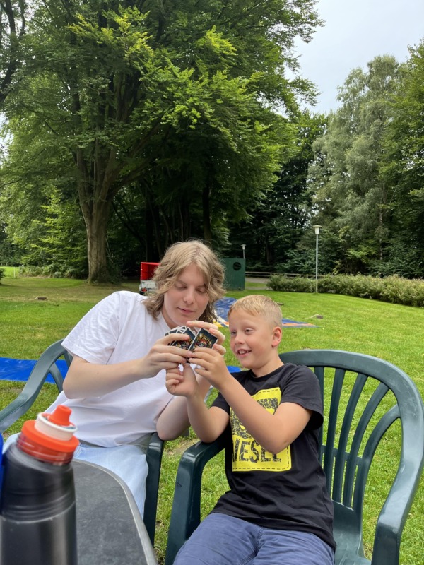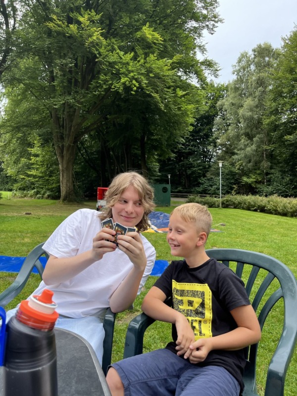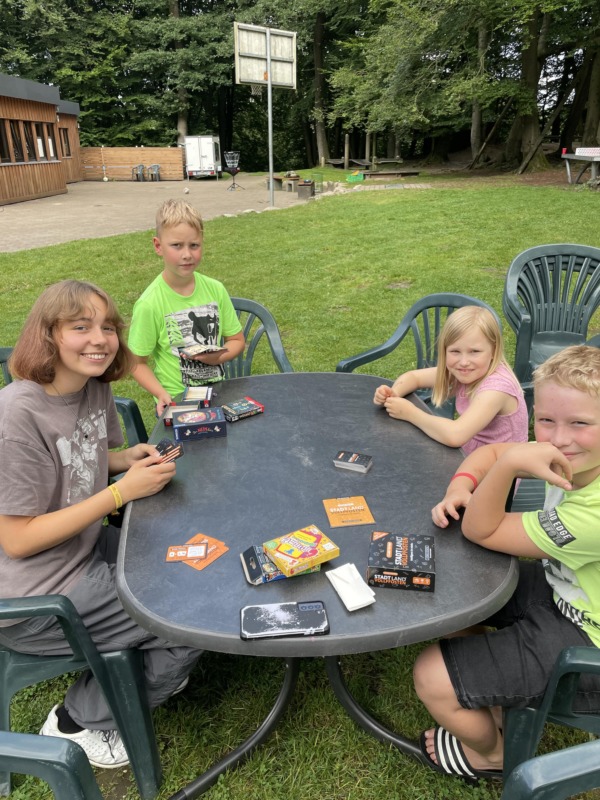 Auch diesen Sommer haben unser Spiele-Anhänger und das Angebot vor Ort in Eulenberg wieder viele tolle gemeinsame Spiele ermöglicht. Am „Tag der Turniere” gab es spannende Duelle in Tischtennis, Air-Hockey, 4-Gewinnt (in extra groß!), Wasser-Pong und dem NeinHorn-Kartenspiel. Aber auch an den anderen Tagen wurde von morgens bis abends eine große Bandbreite an Spielen angeboten: Skull King, alle Formen von Uno, Lotti Karotti… und natürlich Werwolf! Alle Teilnehmenden hatten dieses Mal riesigen Spaß an den besonders großen Werwolf-Runden, deshalb gab es zum Ende der Woche sogar selbst angeleitete Werwolf-Runden ohne Leiter*innen, die sowohl von den großen als auch kleinen Teilnehmenden moderiert wurden – alle sind in ihren Rollen über sich selbst hinausgewachsen!